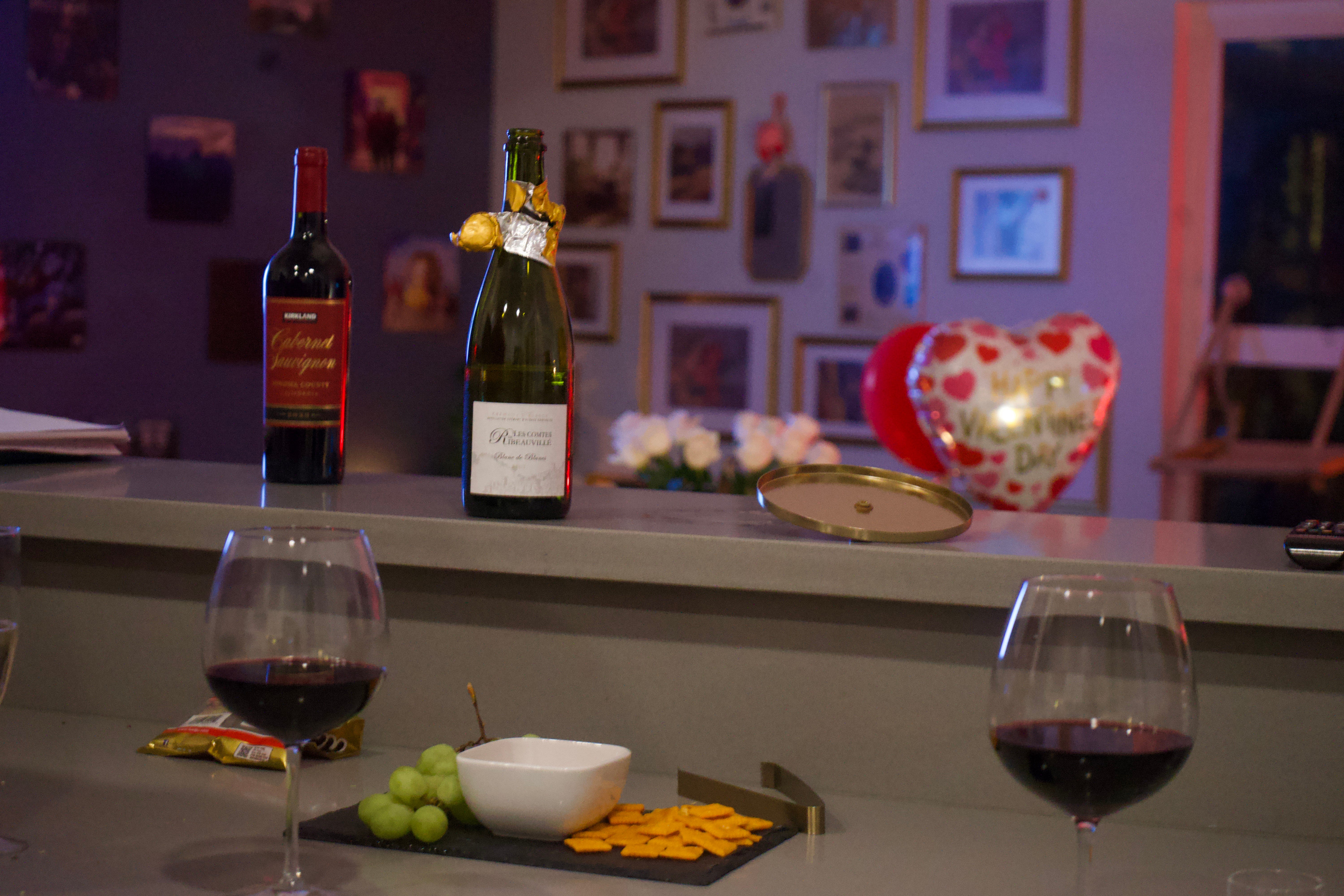 The wine glasses are foregrounded, lived in. The balloon is blurred, symbolic and not central. Romance is present but not dominant. This is the reclaim.